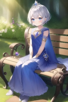 masterpiece, best quality, she sit on bench, full body , cute , pretty, kawaii, child , the little sturdy magical girl , clear silver inward curl short hairs , a miracle staff in hand , short sleeve beautiful indigo dress with embroidery, fair skin, cute detailed eyes , opera groves , elegant long greaves , armlets, miracle jewel, short cloak , princess tiara, elaborately painted, {{{best quality }}}, {{{best detailed}}} , {{masterpiece}}