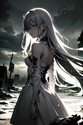 horror style, ghosts girl, ghost town, expressionless girl shadow, white long hair, hair over one eyes, white dress, ruins, cloudy eyes, backlight, cinematic lighting, dynamic angles, apocalyptic atmosphere,