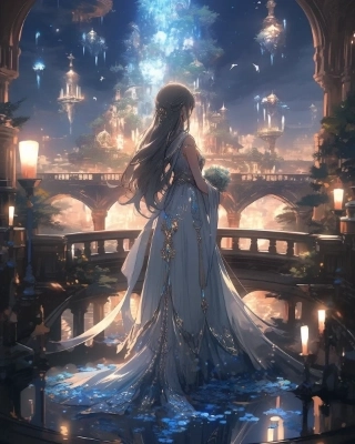 A beautiful woman in an intricately and delicately designed dress walking in a meadow at night where wildflowers bloom. The star-filled sky and the fantastic aurora borealis floating there. Her beautiful face and brightly colored shining eyes. The area is faintly illuminated by the glow of the aurora borealis. Detailed drawing. Vivid colors. High image quality. --s 1000 --ar 4:5 --niji 5