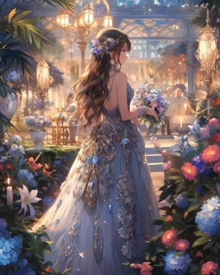 野花が咲く夜の草原を歩く、緻密かつ繊細なデザインのドレスを身に着けた美女。満点の星空と、そこに浮かぶ幻想的なオーロラ。美しい顔立ちに、鮮やかな色彩の輝く瞳。オーロラの輝きに照らされて、辺りが淡く輝いている。詳細な描き込み。鮮やかな色彩。高画質。