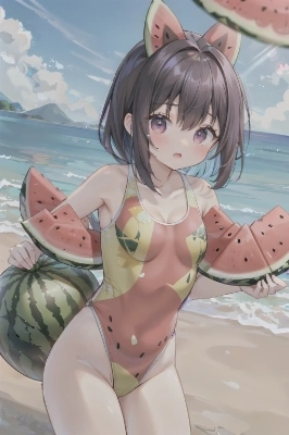 「1girl, watermelon_swimsuit」でt2i生成したら、こんな水着ができました。(他のプロンプトはi2i時に追加してます) AIさんは私の性癖、良く分かっておられるw (スイカなのに、ちっぱい) ※間違えていたので修正。「1girl, watermelon」ではなく、「1girl, watemelon_swimsuit」でした。