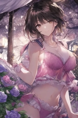 masterpiece, best quality, , 18 years old, waterfall, butterfly, feminine, girl, solo, beautiful detailed hair, beautiful detailed eyes, hair ornament, choker, ribbon, necklace, garden, beautiful detailed camisole, beautiful detailed bra, beautiful detailed underwear, , dress, Ruffled trim and frill sleeves, cowboy shot, official art, {{ultra-detailed}}, {{masterpiece}}, {{high resolution}}, with blush cheeks, dynamic fuzziness, intricate light, colorful, hdr, Braided style with long hair and three fishtail,