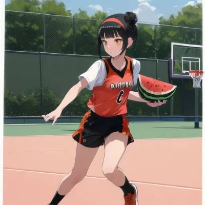 masterpiece, best quality, viewfinder, Illustration,1girl,(orange eyes),(forehead), short hair(black hair),(blunt bangs, sidelock, black hairband, single right side bun),small breast,((wearing basketball uniform)), ((running in the basket court)), (((single middle watermelon))), (((watermelon jump shot))),dynamic pose, depth of field, concept art,