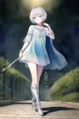 masterpiece, best quality, sshe get angry and show fighting spirit at the street, the little sturdy magical girl , clear silver inward curl short hairs , a miracle staff in hand , short sleeve beautiful indigo dress with embroidery, short skirt , fair skin, cute detailed eyes , opera groves , cool , cute , pretty, kawaii, child , cinematic light , amazing, full body , elegant long greaves , armlets, miracle jewel, short cloak , princess tiara, elaborately painted, {{{best quality }}}, {{{best detailed}}} , {{masterpiece}}