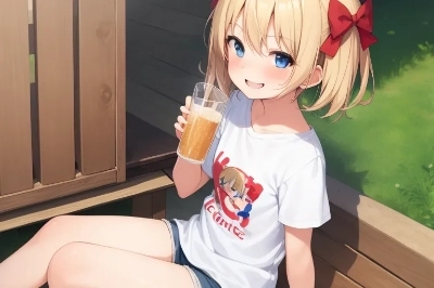 masterpiece, best quality, 1girl,loli,blond hair,short hair,hair bow,red bow,blue eyes,t-shirt, short shorts,(drinking beer:0.7),full-face blush,summer,sitting,crazy smile,lying,sleeping,empty_cans,many cans,many beer cans,