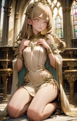 Kneeling in prayer in church,wearing white cloth,hands clasped in front of chest,side view,serious expression,statue of evil god,stained glass,chapel,blonde beauty,20 years old,full body,beautiful face,(symmetrical clear eyes:1.3),gold eyes,flower-shaped pupils,long eyelashes,double eyelids,detailed long hair,bangs,detailed fingers,realistic face,realistic body,small-chest,(super fine illustration:1.3),masterpiece,super high resolution,extremely delicate and beautiful,Amazing,finely detail,extremely detailed CG unity 8k wallpaper,absurdres,depth of field,far from viewer,cinematic angle,beautiful detailed background