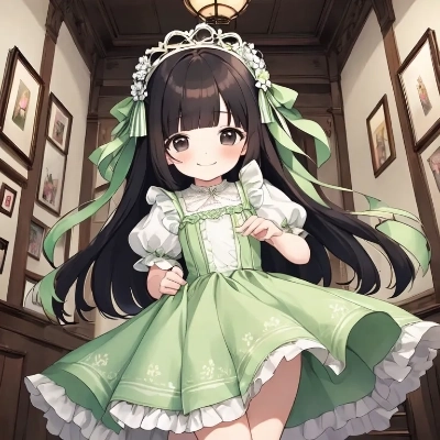 black hair, smile, (((Long Hair))),straight Hair,hair ribbon,mintgreen stripe,Black Eyes,flat chest,straight Across bangs,princess Cut, Very Long Sideburn,roundry Head,Droping eyes,1 Girl,cute,Meekness,Bob Cut,long back hair,12 years Old,school,hallway