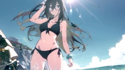 (best quality illustration:1.2), (1girl, solo:1.4), (wide shot:1.3), looking away, (medium hair:1.4), (half updo:0.9), (gray eyes:1.3), (blush:0.8), (medium breasts:1.1), (wearing frilly low-rise bikini:1.2), summer, ocean, sand, palm trees,