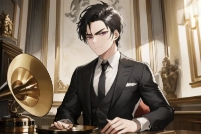 (best quality, masterpiece:1.2),1man,solo,indoors,purple eyes,slanted eyes,cool expression,V-shaped eyebrows,short black hair,clean-cut,cropped at the neck,seventy-thirty bangs,straight nose,expression lines,throat,dressed in black suit,black tie,white shirt,gramophone
