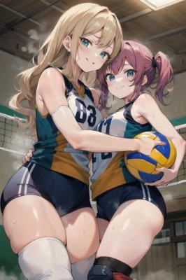 (((masterpiece))), (((best quality))), (((ultra detailed))), (((high-resolution))), ((super fine illustration)), ((Ultimate cutie)), detailed beautiful face, shiny hair, (((gyaru))), 2girls, (medium breasts), (((smirk))), (blush), (2female volleyball players hugging each other), ((holding the volleyball ball)), (Volleyball Uniform), sleeveless volleyball uniform, buruma, (knee pad), (elbow pad), ((sweat)), ((covered in sweat)), steam, in Volleyball Court, indoor, lighting, from below, looking at viewer