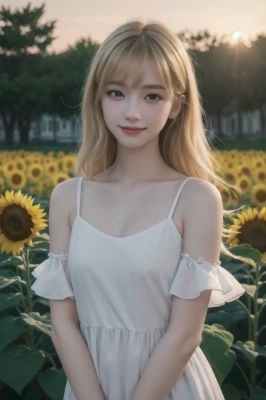 Vincent van Gogh\'s \"Sunflowers\",Loving viewer very much,on a date in a park,wearing a pretty frilly dress,clinging to viewer\'s arm,peeking out from the side,looking at viewer,smiling shyly,blushing,garden at sunset in the background,blonde beauty,20 years old,full body,beautiful face,(symmetrical clear eyes:1.3),gold eyes,flower-shaped pupils,long eyelashes,double eyelids,detailed long hair,bangs,detailed fingers,realistic face,realistic body,small-chest,(RAW photo,best quality),(realistic,photo-realistic:1.3),masterpiece,super high resolution,extremely delicate and beautiful,Amazing,finely detail,extremely detailed CG unity 8k wallpaper,absurdres,depth of field,far from viewer,cinematic angle,beautiful detailed background