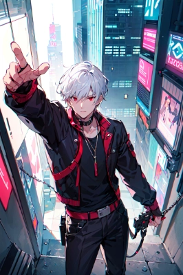 (exceptional, best aesthetic, new, newest, best quality, masterpiece, extremely detailed, anime,), a cool boy, good-looking guy, handsome man, shorthair, silver hair, yellow eyes, ikemen, perspective, cyberpunk, night, fighting, cool, sweating