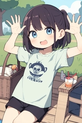 mitsudomoe,marui mitsuba,1girl,blush,brown eyes,brown hair,full body,hair ribbon,hood,hoodie,kneehighs,open mouth,ribbon,short hair,short twintails,skirt,smile,socks,solo,striped,striped socks,short twintails,