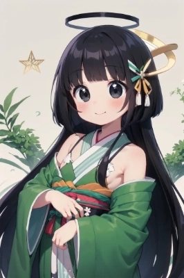 (((best quality))), ((ultra-detailed)), (illustration), (detailed light),extremely best quality, high resolution, black hair, smile, (((Long Hair))),straight Hair,hair ribbon,mintgreen stripe,Black Eyes,flat chest,straight Across bangs,princess Cut, Very Long Sideburn,roundry Head,Droping eyes,1 Girl,cute,Meekness,Bob Cut,long back hair,12 years Old,loli,flower print,lift up,courtesy,stand up,sightviewing,street,High touch,hello,Halo,(((raising hand))),salute,angel