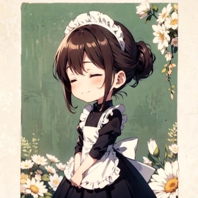 chibi maid, brown hair, chignon hairstyle, closed eyes, long skirt, curtsy, hands on sides of skirt, bowing, looking down, gentle smile, round flower border background