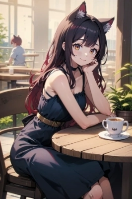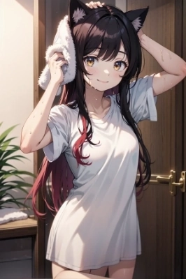 cute girl, teen, small breast, black hair, medium long hair, red inner colored hair, cat ears, gold eyes,