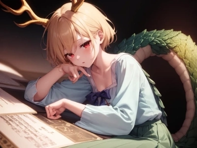 (masterpiece), (best quality), super fine illustration, best quality, super detailed skin, insanely detailed, solo, 1 girl <lora:touhou_kicchou-17:1> kicchou yachie, dragon girl, antlers, blue shirt, bow, long sleeves, green skirt, turtle shell, dragon tail, sleeping