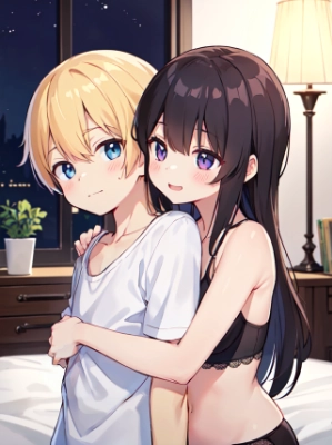 (hug, hold:1.2), (happy, pleasure, satisfied, love), upper body, indoor, cute roomwear, chichiawase,