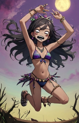 belly chain, necklaces, anklets, bracelets, dancing, jumping, cowboy shot, micro bikini, princess zombie