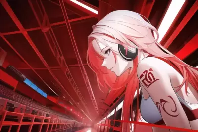 red hair, looking at viewer, perspective, sports bra, official art,high quality,production art,novel illustration,best,high resolution,best quality,award winning,highly detailed,masterpiece,by famous artist,hyper extreme detailed, headphones, realistic, 666, arm tattoo, profile