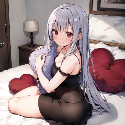1girl, solo, cute face, kawaii, silver hair, long hair, blunt bangs, red eyes, smile, closed mouth, medium breasts