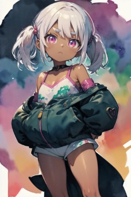 12 years old, flat chest, pigtails, short hair, silver hair, (dark skin:1.4), big eyes, round eyes, droopy eyes, pink eyes, glowing eyes, tareme, thick eyebrows, long eyebrows, bushy eyebrows, cute, kawaii, child, shota, illustration, pixiv, anime, manga. artist by Tetsuhiro KOSHITA, comic, game, thick outline, heavy outline, solo, (watercolor:1.4).mountaineering, concentration, standing, looking at map, mountaineering jacket, gloves, mountaineering pants, hiking boots, mountain path, back view