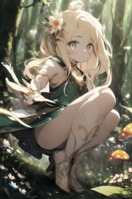 Fantasy,squatting and picking mushrooms,wearing mushrooms,looking from side,looking at viewer,shyly smiling,blushing,fairy tale forest in background,blonde beauty,20 years old,full body,beautiful face,(symmetrical clear eyes:1.3),gold eyes,flower-shaped pupils,long eyelashes,double eyelids,detailed long hair,bangs,detailed fingers,realistic face,realistic body,small-chest,(super fine illustration:1.3),masterpiece,super high resolution,extremely delicate and beautiful,Amazing,finely detail,extremely detailed CG unity 8k wallpaper,absurdres,depth of field,far from viewer,cinematic angle,beautiful detailed background