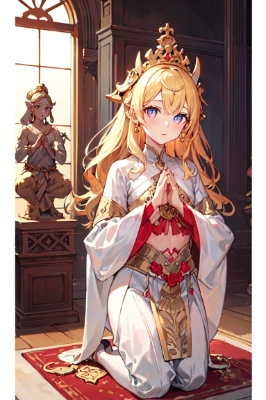 神殿で祈りを捧げる金色の髪の少女