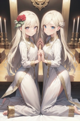 陰陽の神像に祈りを捧げる金色の髪の姉妹