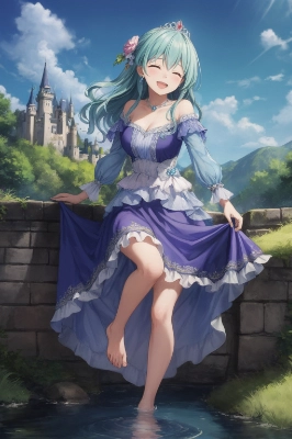 The castle is visible in the rear distance. Blue sky. Detailed drawing. Vivid colors. High image quality. detailed background, perfect anatomy, <lora:add_detail:0.6>