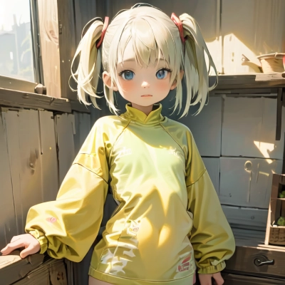 masterpiece, best quality, extremely detailed, anime, Young Girl, AI, Blond Hair, friendly look, Loli, Home Clothes, Yellow clothes, nfsw, more skin visible , bra, top
