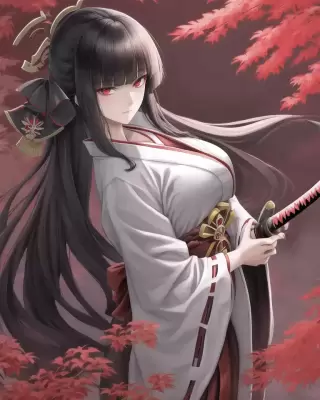 mature woman, holding katana, black long hair, blunt bangs, hime cut, red eye,(miko:1.3), white kimono red hakama, medium breasts, (bloodstained:1.2), in japanese dark forest, beautiful background, midnight, best quality, hand on grip katana 22