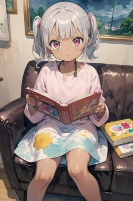 (watercolor:1.4), twintails, short hair, (silver hair:1.4), (dark brown skin:1.4), pink eyes, big eyes, round eyes, droopy eyes, tareme, thick eyebrows, long eyebrows, bushy eyebrows, cute, kawaii, 9 years old, child, kid, infant, illustration, pixiv, Kyoto Animation, anime, manga, artist by Tetsuhiro KOSHITA, comic, game, thick outline, heavy outline, solo. Theme: Colorful Rainbow.Role: Rainbow Girl.Activity: Dancing in the rain.Expression: Joyful and vibrant.Atmosphere: Playful and magical.Pose: Twirling with arms extended.Outfit: A multicolored dress with a rainbow pattern.Location: A grassy field with a rainbow in the background.Items in the location: Flowers, butterflies, and a sparkling waterfall.Composition: the character centered.Angle: Slightly low angle to capture the character\'s movement and the rainbow.Effects: Water splashes around the character and sparkles in the air.