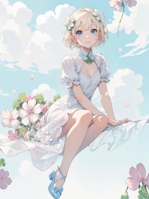 (kawaii background:1.3), (extremely detailed fine touch:1.3), (hard light, studio light, light rays, dappled light, reflection, shadows, ray tracing:1.0), ///, girl, pink blonde short hair, Princess, full body, sky, cloud, flower, sneakers, running