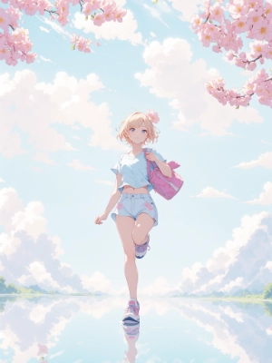 (kawaii background:1.3), (extremely detailed fine touch:1.3), (hard light, studio light, light rays, dappled light, reflection, shadows, ray tracing:1.0), ///, girl, pink blonde short hair, Princess, full body, sky, cloud, flower, sneakers, running