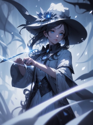 (blurry background:1.3), (extremely detailed fine touch:1.3), (hard light, studio light, light rays, dappled light, reflection, shadows, ray tracing:1.0), ///, (girl:1.3), Wizard, (magic circle:1.3), big hat, magic wand, lightning effect, slow motion, petals blowing in the wind