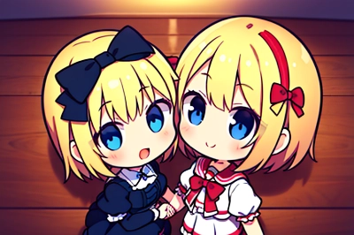2girls,loli,blond hair,short hair,hair bow,red bow,blue eyes,(runnig:0.7),gym uniform, Running face,(tired-looking face:1),(disgust:1.2),