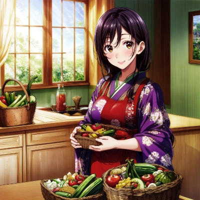 masterpiece, best quality, high resolution, ultra-detailed, cinematic lighting, 1woman, glossy dark hair, Cucumbers, eggplant, tomatoes, peppers, okra, and corn. A basket of fresh summer vegetables is shown with both hands. A woman in a kimono and white apron. The kitchen is lit by the soft sunlight. Detailed drawing. High image quality. detailed background, perfect anatomy, <lora:add_detail:0.6>, kindly smile, nose blush