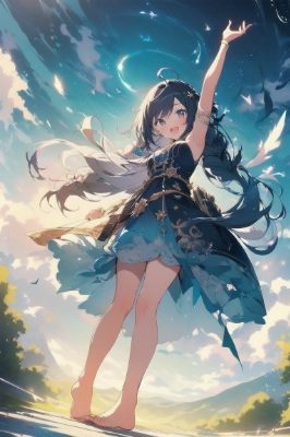 masterpiece, best quality, extremely detailed, anime, colorful, own hands together, happy, promises, cute girl, A young girl eagerly waits, her eyes filled with anticipation, as the setting sun casts a warm glow on the horizon. She clutches a small bouquet of wildflowers, picked with love and tenderness. The air is thick with excitement, as if the universe itself knows that something magical is about to happen. This moment is a promise of joy, of connection, of a future filled with endless possibilities.