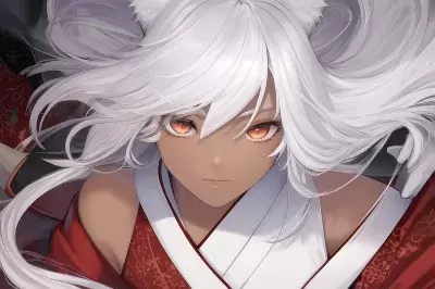 fighting, (masterpiece)+, (hyperrealistic)++, (novel illustration)++, (solo)++, (brave female)+, (dark-skinned girl)+, (fox ears)+, (white hair)++, (simple japanese kimono)++, (detailed face)+, (beautiful detailed eyes)++, small chest, (straight arms)++, sharp eyes,