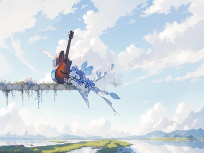 (blurry background:1.3), (extremely detailed fine touch:1.3), ///, girl, black short hair, white bikini, swimsuit, mixed media, diverse materials, unexpected combinations, creative exploration, flower, blue sky, horizon, white cloud, reflection, ruins