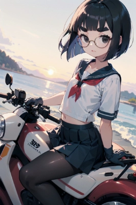 (1 girl), (masterpiece,best quality), (extremely detailed illustration), (ultra-highdetail)(extremely awesome detailed pretty beauty face, beauty face), (Perfect anatomy), (perfect hands, nice hands), (medium bob, blunt bangs, shiny hair, black hair:1.8), (thick eyebrows:1.8), (black eyes:1.8), (glasses:1.8), (skinny young girl), (flat chest, breasts, small breast:1.8), 15yo, (wearing a safety helmet), (Tokoname promenade), (sunny summer sky), (high school girl straddling a small motorcycle), ((honda super cub)), wearing white gloves, (wearing sailor suit, navy blue pleated skirt, tights),