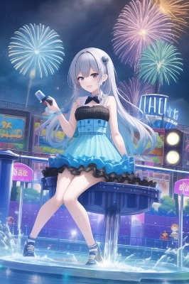 public park, amusement park, water spray, splashing water,Blue hair, Starry prismatic night, nendroid, (masterpiece), (best quality), (illustration),(Autochess:0.9),(symmetric:0.6)//,Auto battler,+dynamic,chibi,moba,game,pvp,++Chequer