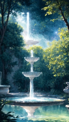 masterpiece,best quality,extremely detailed,extremely beautiful landscape,extremely detailed landscape,light color,effected (post process bloom, soft focus, lens flare, color dodge),bleed watercolor gradation effect,light leaks,mystic atmosphere,wind effect, bright effect, light particle effect,holographic,luminous glow,(play in the water with a fountain:1.2),<lora:flat2:-0.7>,