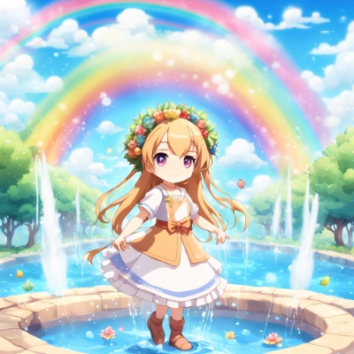 In a quiet park, under a blue sky, a splendid fountain stands in the center. It sprays water into the air, creating a stunning spectacle. The water droplets are scattered by the wind, forming (angel wings :1.7) that look like delicate and transparent feathers. The sunlight hits these water droplets, making them sparkle.