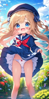 ((masterpiece)) (best quality) (beautiful detailed eyes) (ultra-detailed) (finely detail) (highres) ((((little female child)))) ((loli)) ((toddler)) two side up long blonde hair ribbon blue long one piece blue long sailor dress blue school uniform blue sailor collar blue pleated dress sailor fuku beret long sleeves blue eyes floral garden white panties [[embarrassed blush smile]] closed mouth sitting on grass holding legs beautiful landscape scenery wide shot