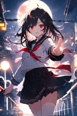 (extraordinary, best beauty, new, best quality, ultra-detailed 1.0, highly detailed, detailed background, best quality, highly detailed) 16 years old, female, yandere, medium hair, bangs that extend to one eye, black hair, black sailor suit, red eyes, ruthless Bloody hands and bloody clothes, (holding a bloody knife), (standing and pointing the knife at someone), (expression of despair), (red full moon), (midnight on the way to school).