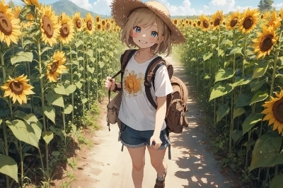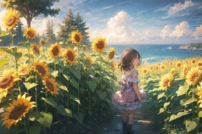 ひまわり畑と少女