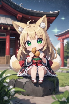お賽銭をもらってご飯を食べる狐っ子巫女