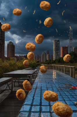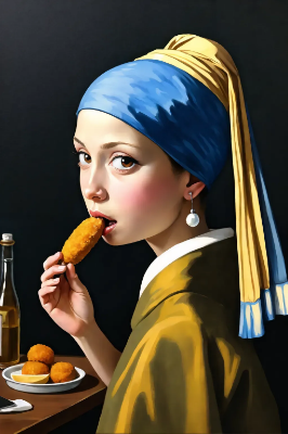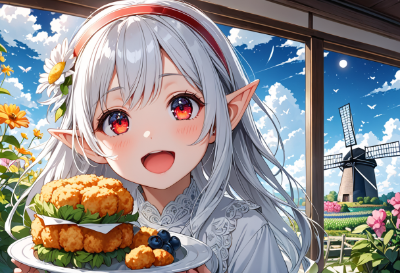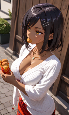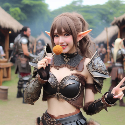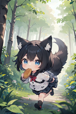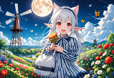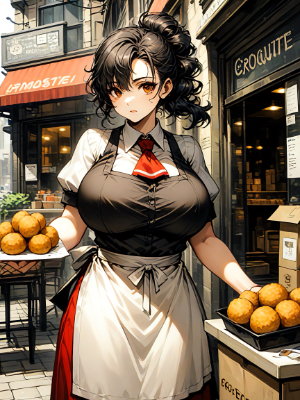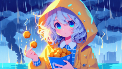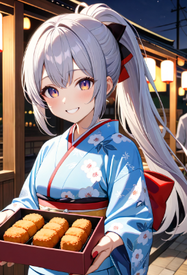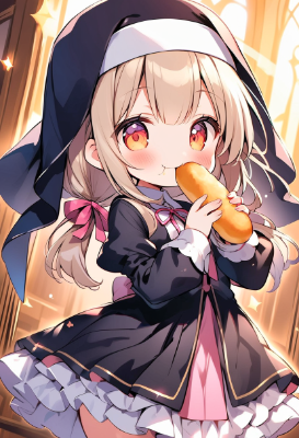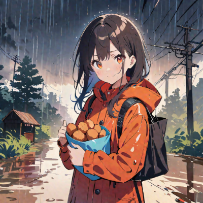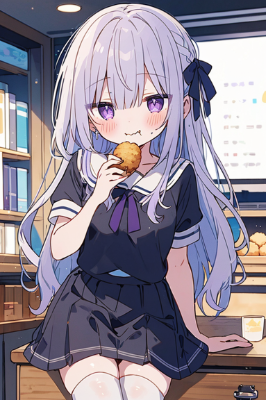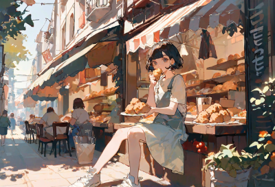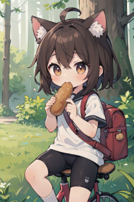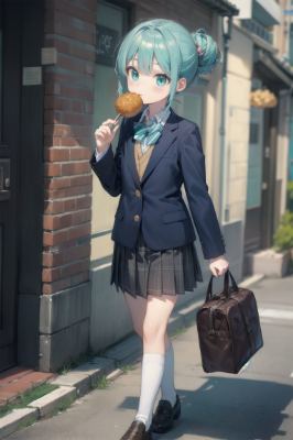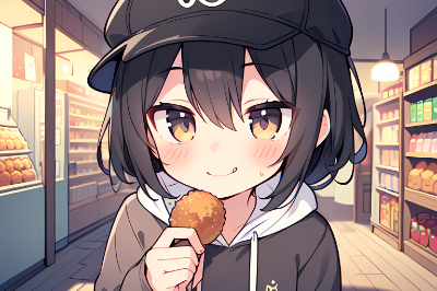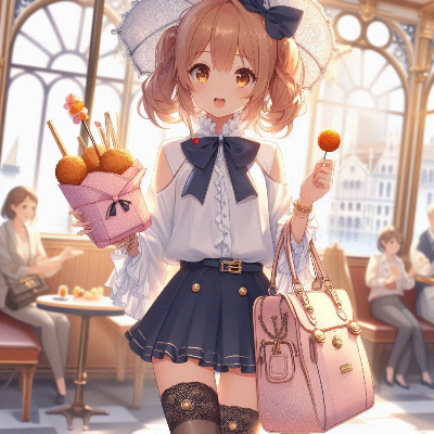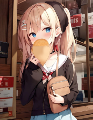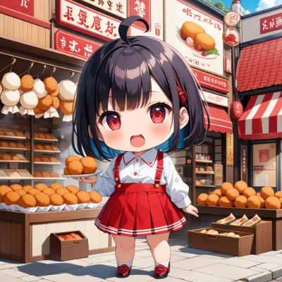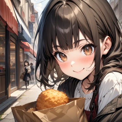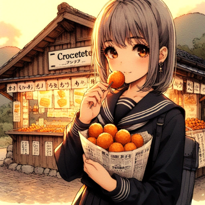 コロッケを食べながら手提げバッグ一つで旅をする女の子